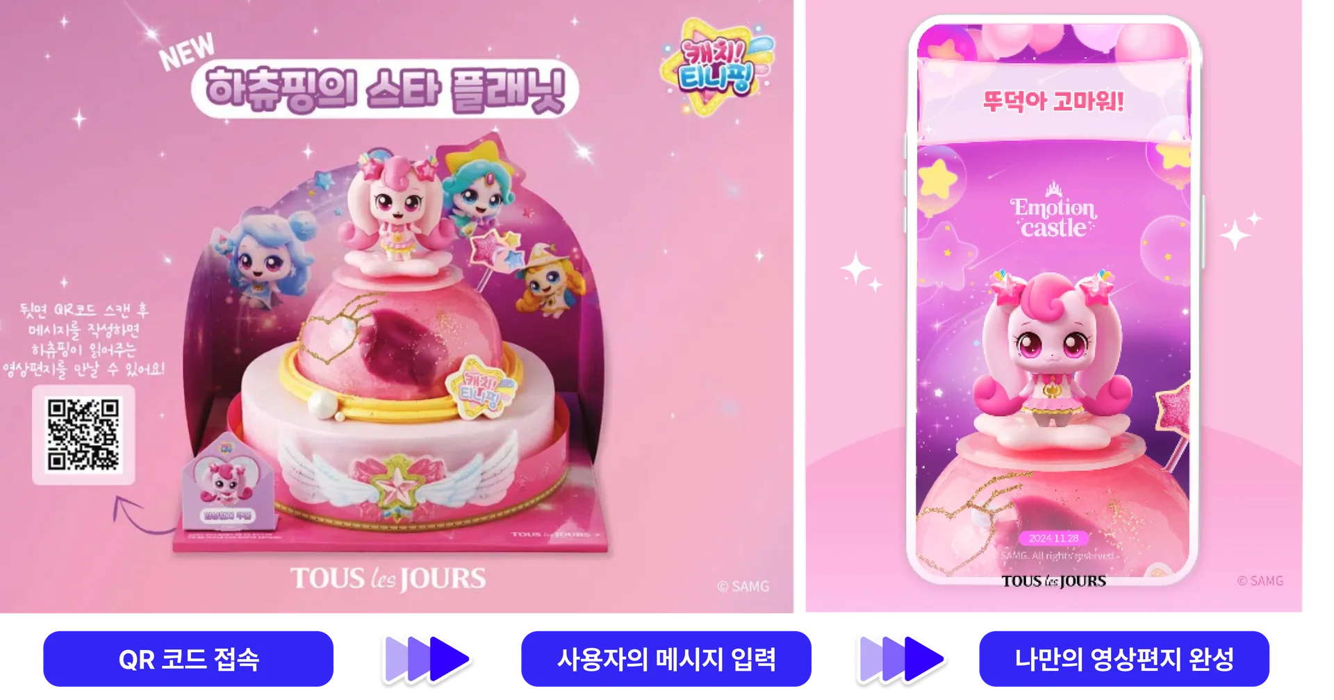 1️⃣ 초개인화된 소장 욕구 자극: 케이크 상자의 QR코드를 통해 메시지를 입력하면, 티니핑이 아이의 이름을 부르며 직접 축하해주는 '세상에 하나뿐인 영상'을 즉석에서 생성해 제공
