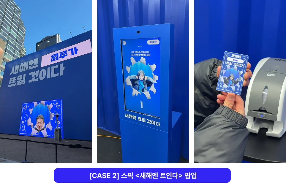 포토부스에서 새해 다짐 문장을 완성하면 사진과 텍스트가 결합된 개인화 카드가 생성됩니다. 여기서 그치지 않고 결과물이 즉시 대형 미디어 월에 송출되도록 설계하여, 개인의 다짐이 공간 전체의 서사로 확장되는 특별한 경험을 선사했습니다.